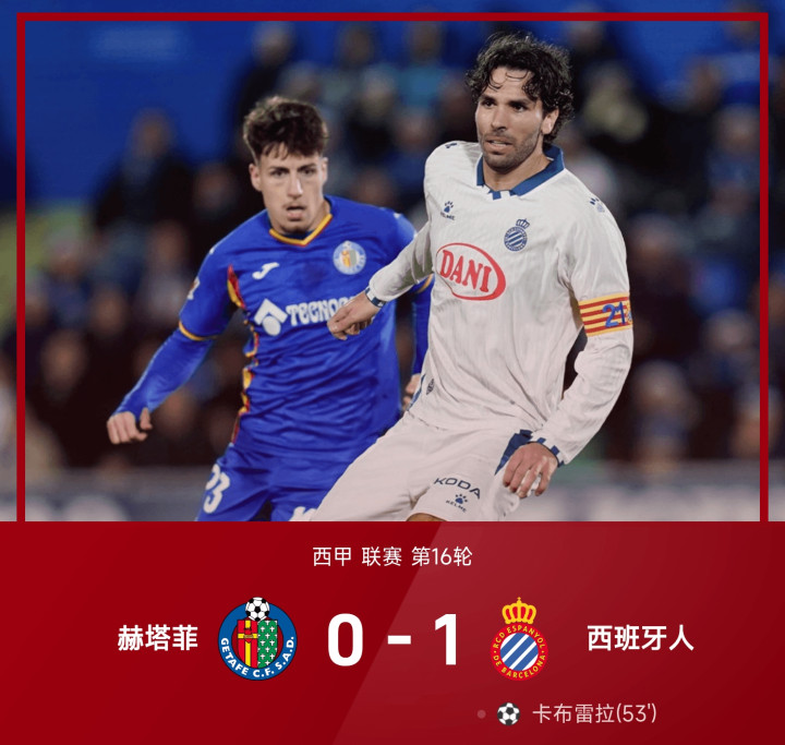 25/26赛季西甲联赛第16轮,西班牙人1-0战胜赫塔菲。全场比赛,卡布雷拉头球破门制胜,基克禁区内疑似肘击逃点,米拉头球破门被吹罚越位在先无效,西班牙人豪取西甲四连胜。