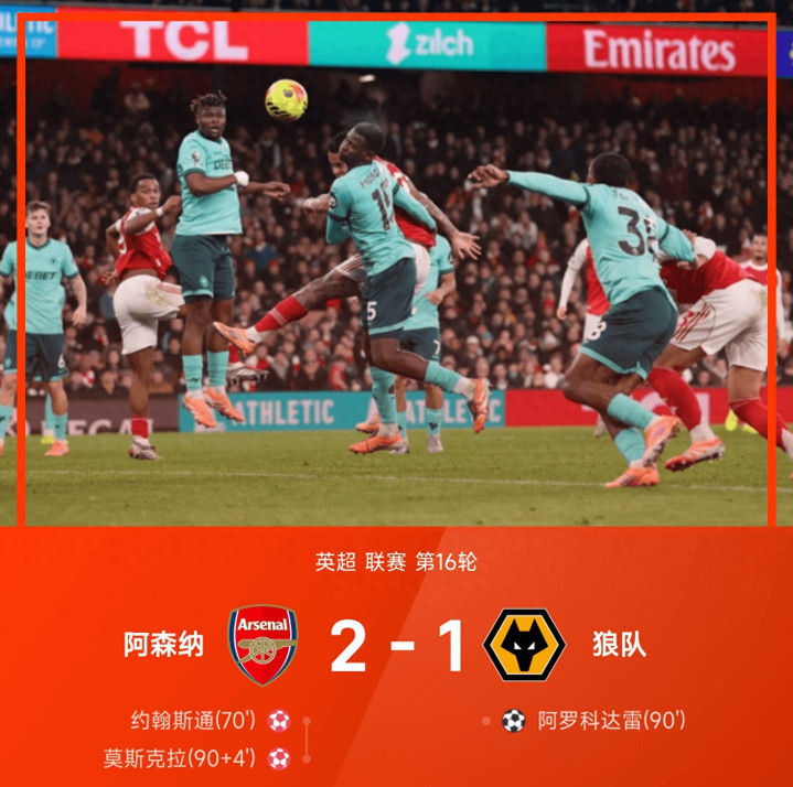 全场比赛:第70分钟,还是阿森纳的角球机会,萨卡主罚开到禁区,皮球直奔后点击中远端立柱反弹砸在门将约翰斯通背上折射入网,萨卡角球造乌龙!阿森纳终于破僵1-0领先,第90分钟,狼队左肋位置M·马内似传似射将球送到禁区,阿洛科达尔头球破门!狼队1-1扳平,第90+4分钟,阿森纳右路萨卡虚晃后传中送到禁区,门前热苏斯抢点头球攻门造成干扰,莫斯克拉不慎自摆乌龙!萨卡本场第二次造成对手乌龙球!阿森纳2-1再次领先,
